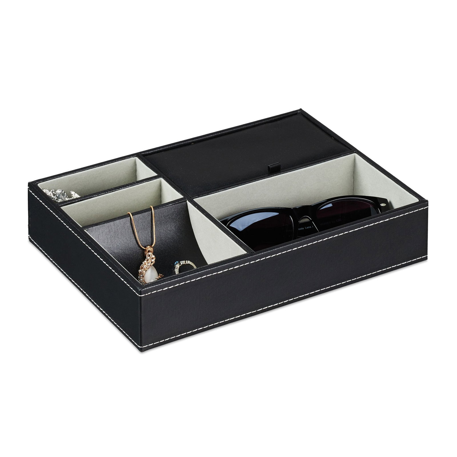 Der Schmuck-Organizer bietet elegante Aufbewahrung und einfachen Zugriff auf Ihre Lieblingsstücke. Das offene Design mit vier Fächern sorgt für schnellen Überblick, während ein Deckelfach vor Staub sc...